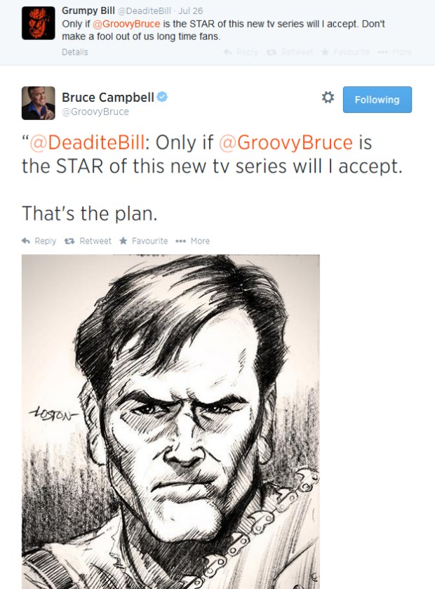Now it seems Raimi and Co want to confuse horror fans even further by what appears to be the announcement of an Evil Dead TV series starring Bruce Campbell as Ash. During last week’s Comic Con in San Diego Raimi spoke about writing the TV series with his brother Ted and Campbell. Of course fans vented their frustrations on Twitter with many stating that they would only ever tune in if Ashley J Williams returned as lead, to which Bruce Campbell replied: